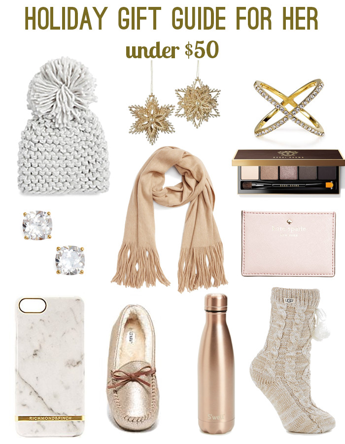 As promised, I will be continuing the gift guide series throughout the next couple months! So today I am talking about gifts for the girl in your clan that are under $50. Whether you are shopping for a friend, teacher, neighbor, or co-worker, there is a gift for everyone! This season's expenses can add up quickly, but you don't have to spend a ton of money to give a thoughtful gift. Afterall, it's the thought that counts right? Two of my favorites on this list are the Swell Bottle, and the Marble Iphone Case. I have several Swell bottles in various sizes, and use them daily! These bottles keep your drinks cold for 24 hours, and hot for 12. The Marble Iphone Case is currently on my personal wish list for this year (*insert heart eyes emoji*) - I linked the case for the Iphone 7, but you can find the same one for the Iphone 6 here. PS, you can never go wrong with white, gold, and marble - am I right!?