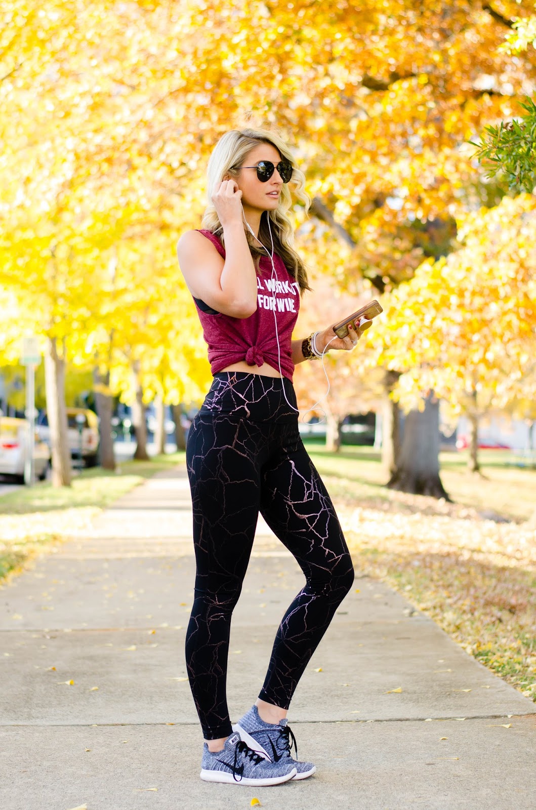 Cheers to all who are still reading! Now that I've rambled and gotten off my virtual soapbox - let's talk about the outfit for a minute. How fun are these leggings?! I have them in a bunch of solid colors, but thought these were so cool! This is random, but they keep reminding me of Bill Nye the Science Guy - LOL. I have two of the solid black ones because they also double as my leggings with oversized sweaters, thermals, and puffer vests and I like that they are reasonably priced. I sized up in this top for a baggier fit so I could knot the bottom of it, so I'm wearing a medium. Even if you aren't planning on wearing it to the gym, it makes a cute athleisure outfit with a zip up jacket thrown over it!